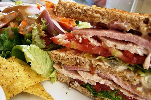 На нижний слой хлеба кладут ломтики швейцарского сыра и поджаренного бекона или корейки, на верхний — ломтики томатов и листочки салата.