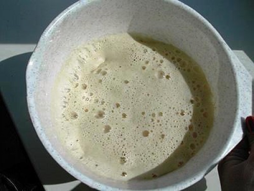 Сначала замешивают ложкой жидкую болтушку, называемую опарой.